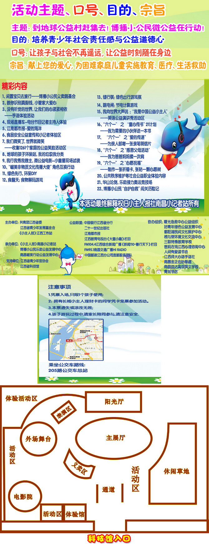 2012年6月1日至2日,由共青团江西省委、江西省青少年发展基金会和《小主人报》江西工作站共同主办,由《小主人报》南昌小记者站、博播小公民乐助公益发展中心和南昌崛美行动公益发展中心承办,由江西省科技馆、江西省青少年协会等多家单位协办的大型公益类主题活动将在江西省科学技术馆展开。届时,孩子们可以参加7大活动区,22类的缤纷活动。在这里,孩子们可以带上闲置的宝贝参加博播小公民义卖跳蚤会,也可以了解食品安全并辨别真假币,同时也可以参加电台节目记者主持人体验和微公益电影现场试镜及“崛美非物质文化传播大使”角色互换行动,也可以参加英语公益演讲和公共秩序维护等社会公益职业体验活动。此外,徜徉在“爱的海洋”里,孩子们可以参加“六个一”系列爱心活动,也可以做个环保小天使,学会垃圾分类、参与绿色出行游戏棋和节电计算游戏;同时孩子们也可以参加乐助接力奥运竞技场和“自护自救”闯关历险记活动,让孩子与社会不再遥远,让公益时刻随在身边。
