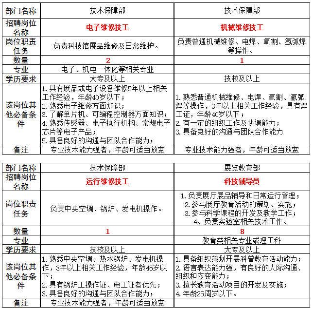 根据科普事业发展需要,现面向社会招聘12名编外工作人员。其中电子维修技工2人,机械维修技工1人,运行维修技工1人,科技辅导员8人。