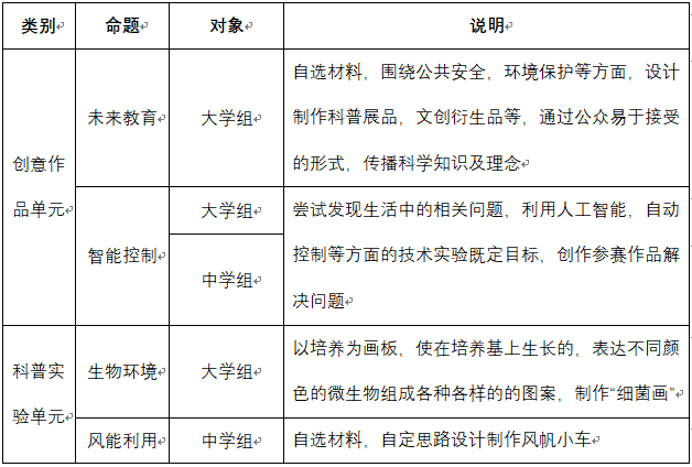 本届大赛以“生物环境”、“风能利用”、“智能控制”、“未来教育”为主题,主以提高全民科学素质,了解未来科学的发展以及科学教育的普及。提高各位青少年的科学理念以及动手实践了解科学的能力。